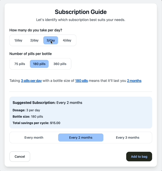 Imagine a quick “subscription guide” link on the product page. A simple guide helps me identify the quantity, dosage, and frequency which makes an informed decision that’s unique to my personal needs.
